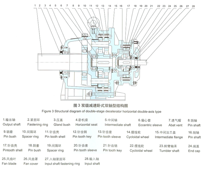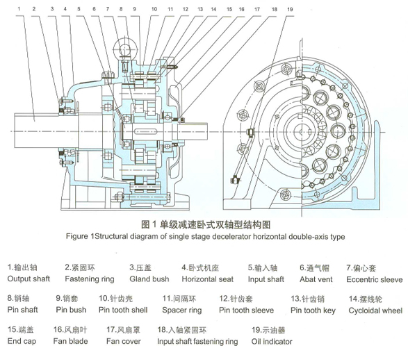 擺線針輪減速機(jī)全部傳動裝置可分為三部分:輸入部分.減速部分、輸出部分。