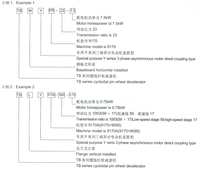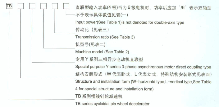 三、型號及規(guī)格 1、型號說明 TBW擺線針輪減速機(jī)為雙軸型、腳板式臥式安裝 TBL擺線針輪減速機(jī)為雙軸型、法蘭式立式安裝 TBWY擺線針輪減速機(jī)為專用異步電機(jī)直聯(lián)型、腳板式臥式安裝 TBLY擺線針輪減速機(jī)為專用異步電機(jī)直聯(lián)型、法蘭式立式安裝